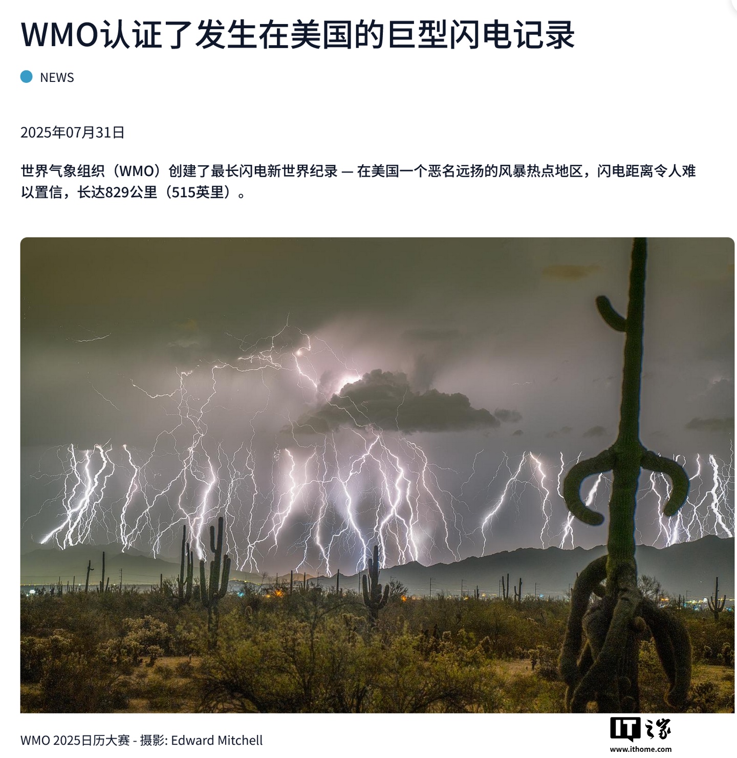IT之家 8 月 2 日消息,世界气象组织(WMO)于 7 月 31 日发布博文,宣布 2017 年 10 月在北美大平原出现了一条长达 829 公里(515 英里)的闪电,创下“最长闪电”新纪录。