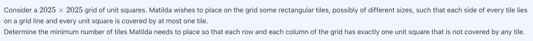 有一个由 2025×2025 个单位正方形组成的网格。Matilda 希望在网格上放置一些矩形图块,这些图块的大小不同,但每个图块的每一条边都位于网格线上,并且每个单位正方形最多被一个图块覆盖。