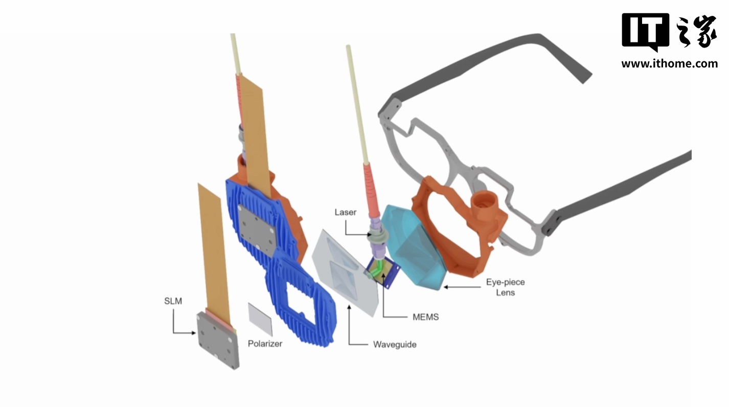 据悉,该原型显示系统采用了微型光纤耦合激光器(分别负责红、绿、蓝三原色),激光光束通过微型高速反射镜(MEMS 镜)引导进入一块定制波导镜片。该波导会将光线扩展并传输至空间光调制器(SLM),最终在眼前重建出全息图像。