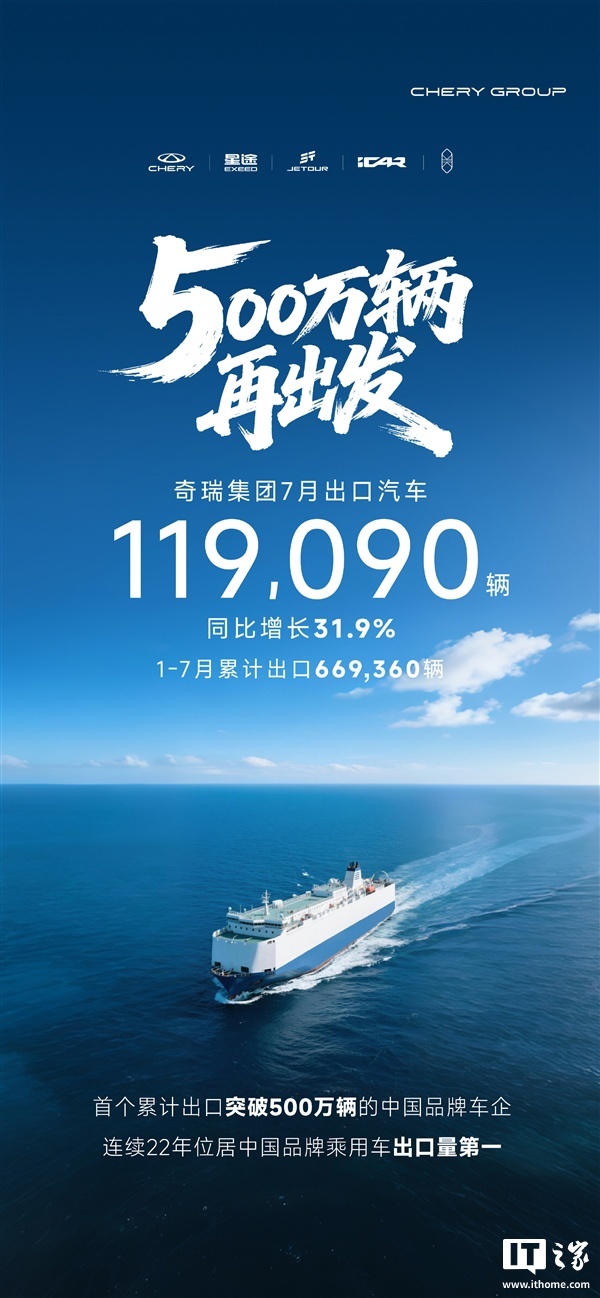 IT之家 8 月 3 日消息,奇瑞汽车今日宣布,奇瑞集团 7 月出口汽车 11.91 万辆,1-7 月累计出口 66.93 万辆。并且,奇瑞成为国内首个累计出口突破 500 万辆的中国品牌车企,已连续 22 年位居中国品牌乘用车出口量第一。