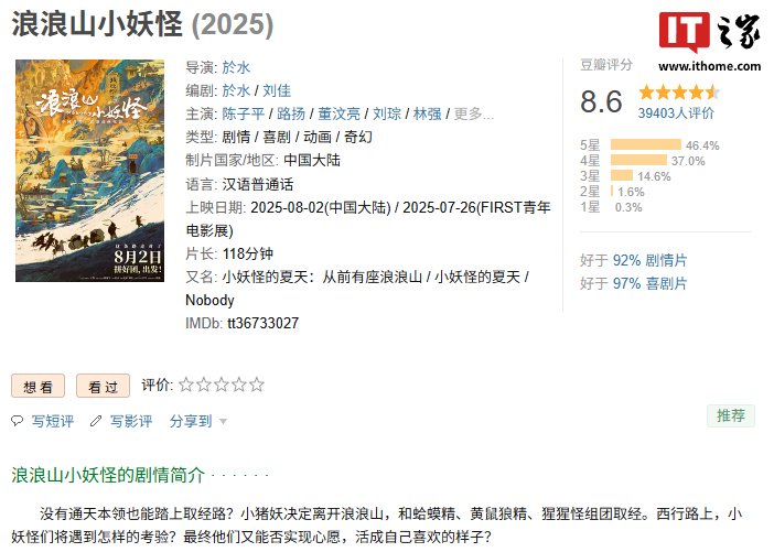IT之家查询获悉,本片昨日首映,已与 IMAX 达成合作,成为首部登陆 IMAX 的国产 2D 动画电影,目前豆瓣评分 8.6。