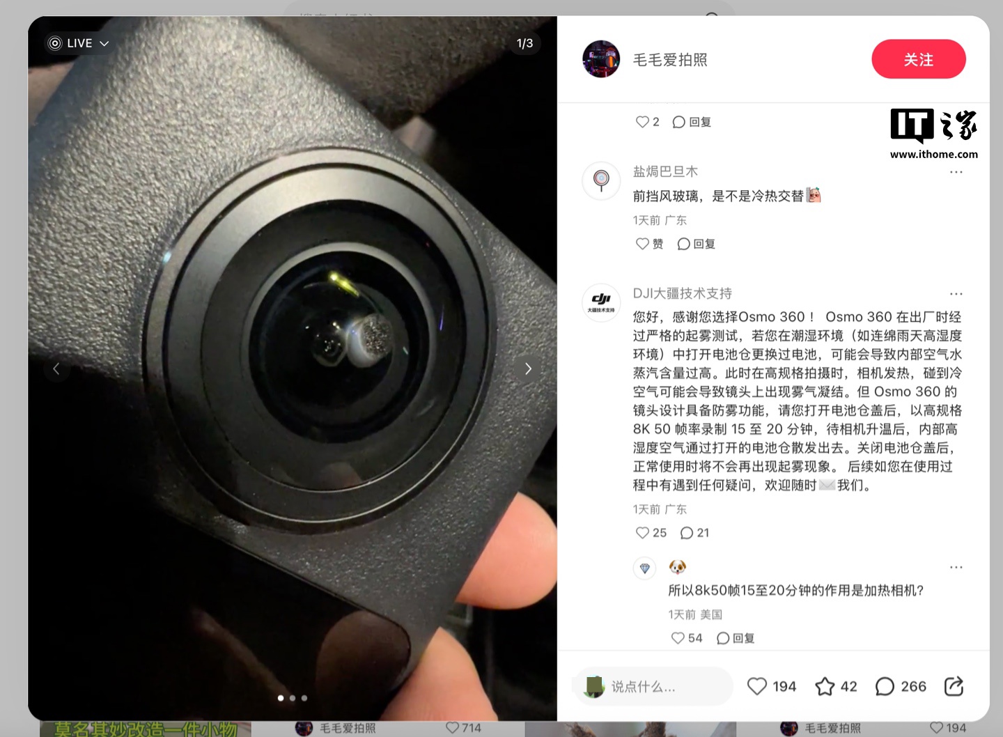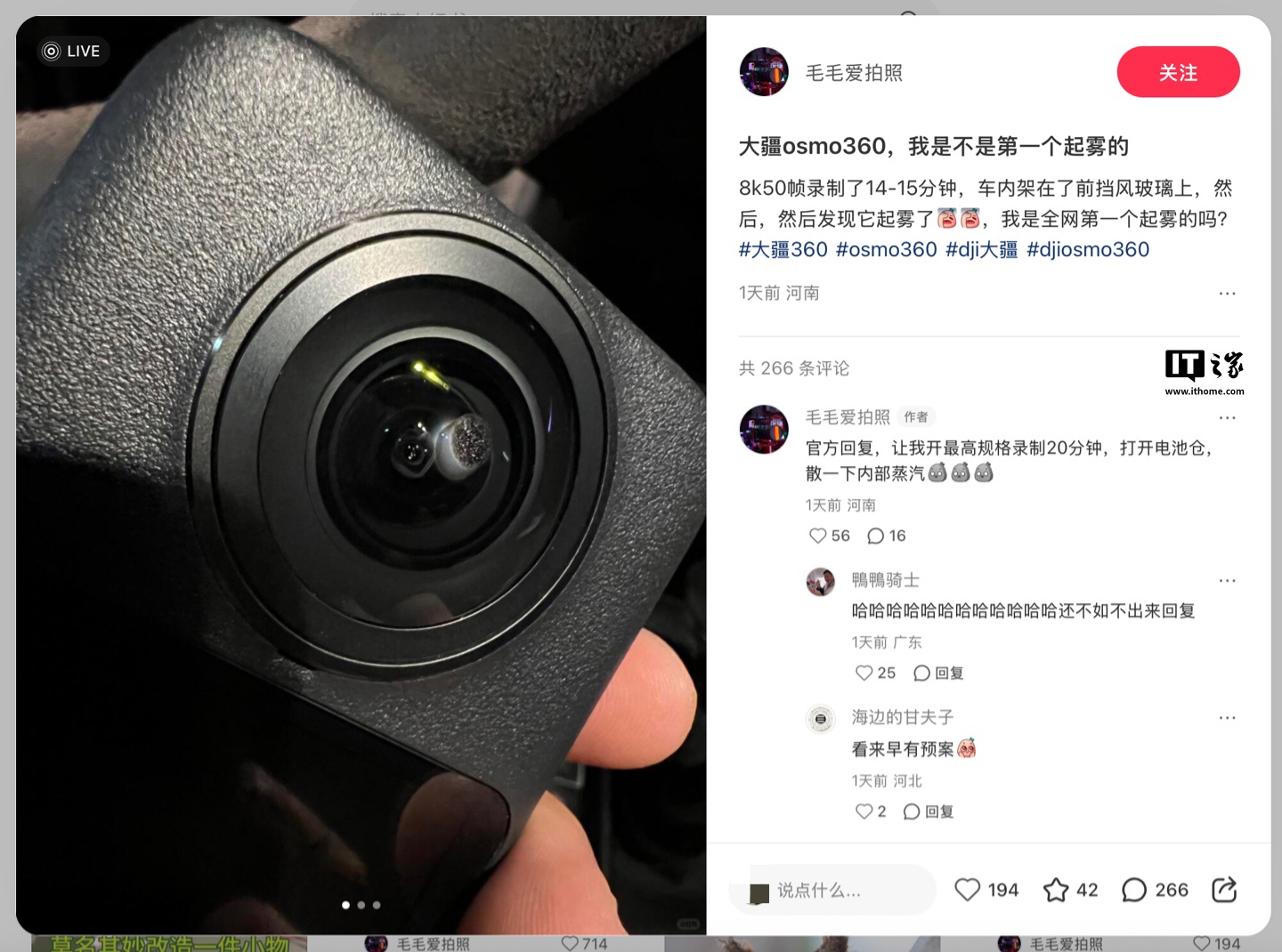 IT之家 8 月 3 日消息,大疆旗下首款全景相机 Osmo 360 于 7 月 31 日发布,定价 2999 元起。上市后有部分用户反馈机器遇到“镜头起雾”情况。有网友在社交平台上发文,称自己使用“8K 50 帧(格式)录制了 14-15 分钟,车内架在前挡风玻璃上,然后发现起雾了。”
