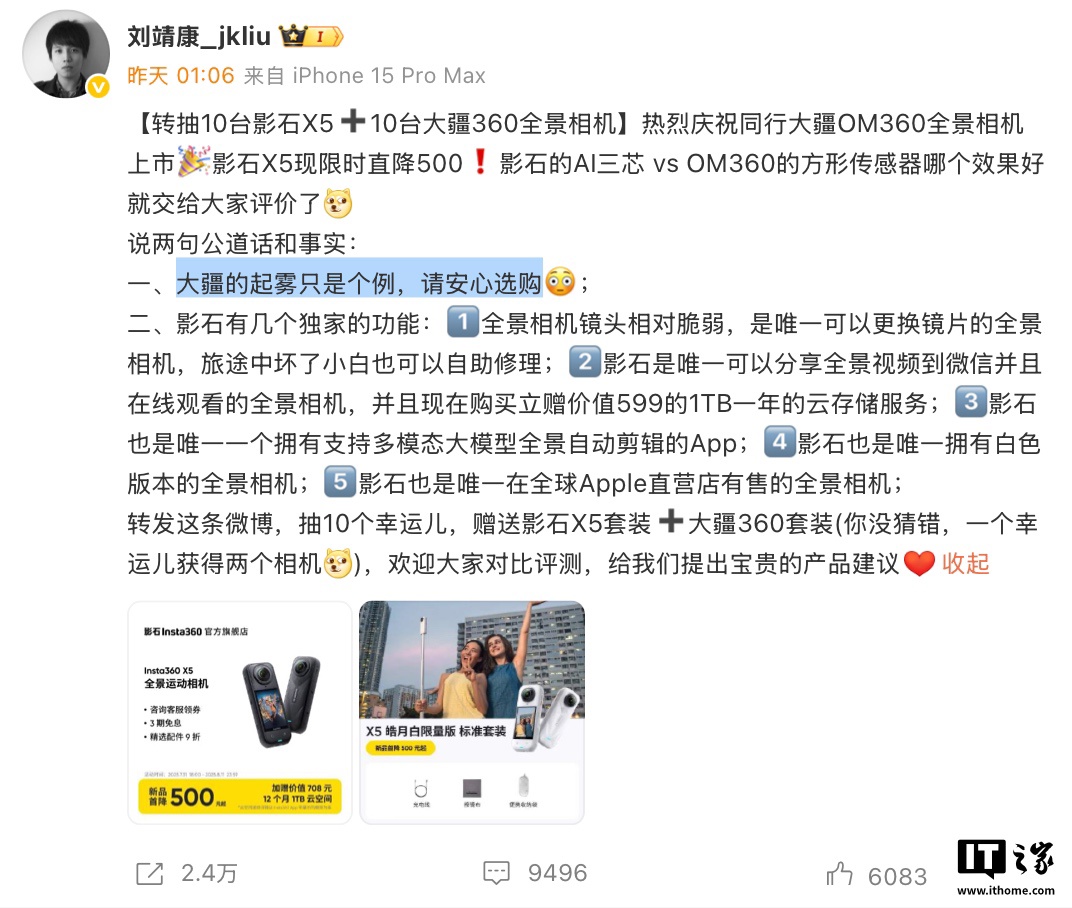 IT之家注意到,此前影石 CEO 刘靖康在微博发文称“热烈庆祝同行大疆 OM360 全景相机上市”,其同时表示“大疆的起雾只是个例,请安心选购”。
