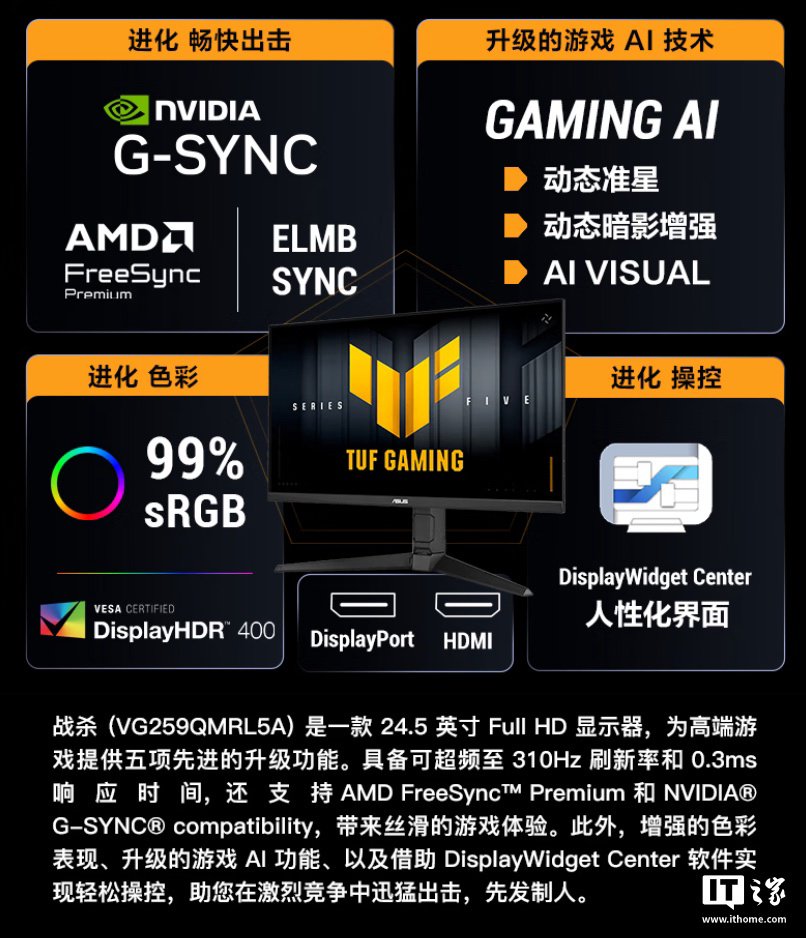 IT之家获悉,该机配备一块 1920x1080 分辨率 310Hz 超频 LED 背光 Fast IPS 面板,显示器亮度 400 尼特,GTG 响应速度 0.3ms,静态对比度 1000:1,显示器支持 8-Bit 色彩,覆盖 99% sRGB 色域。