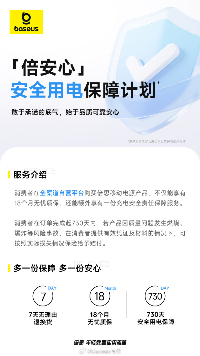 IT之家 8 月 4 日消息,倍思今日宣布“倍安心”安全用电保障计划已正式上线。消费者在全渠道自营平台购买倍思移动电源产品,不仅能享有 18 个月无忧质保,还能额外享有一份 730 天的充电安全责任保障服务。