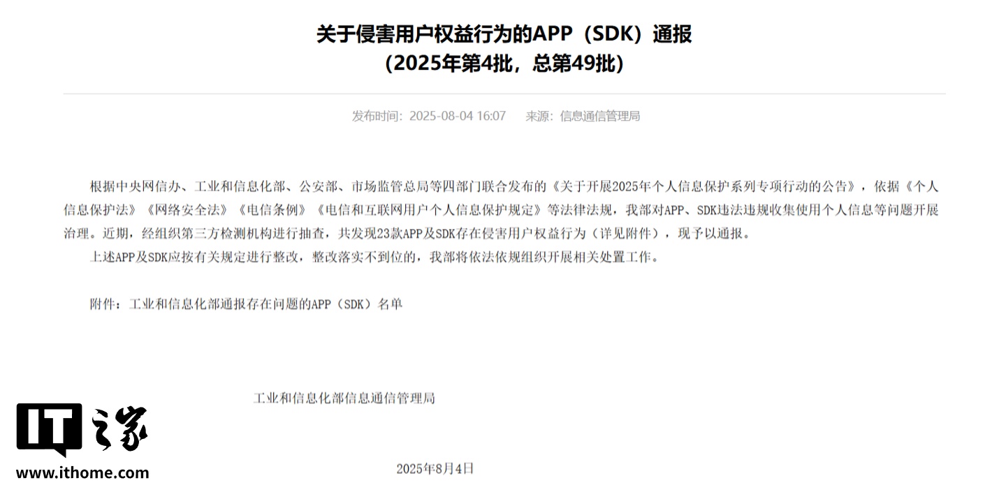 IT之家 8 月 4 日消息,工业和信息化部信息通信管理局今日发布公告,根据中央网信办、工业和信息化部、公安部、市场监管总局等四部门联合发布的《关于开展 2025 年个人信息保护系列专项行动的公告》,依据《个人信息保护法》《网络安全法》《电信条例》《电信和互联网用户个人信息保护规定》等法律法规。工信部对 App、SDK 违法违规收集使用个人信息等问题开展治理。