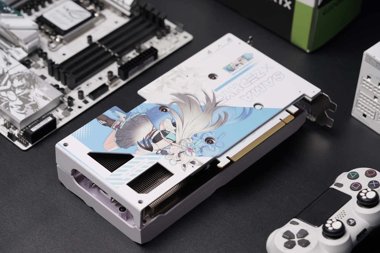 这款联名显卡的背板除“先马姬”二次元形象外还印有合作双方的英文名以及多处西风 "DIYers SAVE DIY" 口号。