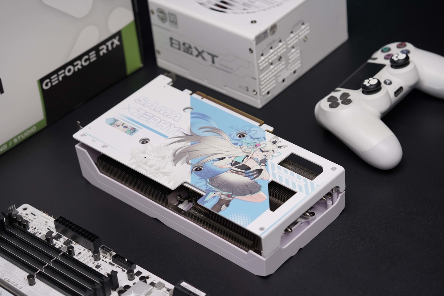 可以看到该显卡的背板和外框以白色为主题色调,PCB 亦为白色,仔细观察可发现 12V-2×6 供电接口,结合背景中的 GEFORCE 包装盒来看高概率是一款英伟达显卡。