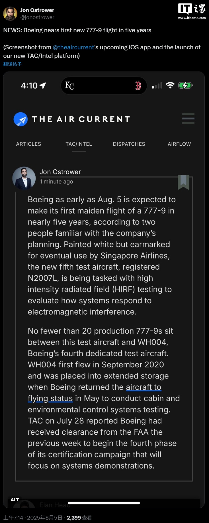 IT之家 8 月 5 日消息,Air Current 编辑 Jon Ostrower 今日在 X 平台发帖称,两位知情人士透露,波音公司预计最早在 8 月 5 日进行其 777-9 型飞机近五年来首次试飞。这是该公司正在生产的最大客机。
