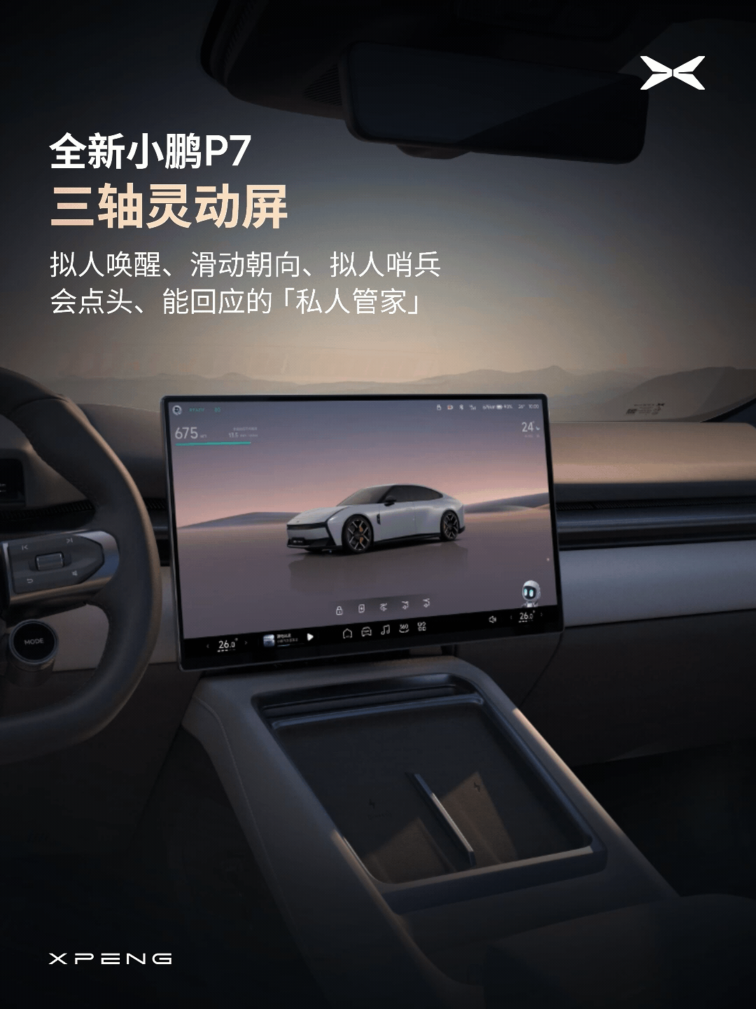 IT之家 8 月 5 日消息,刚刚小鹏汽车公布了全新小鹏 P7 的更多内饰细节,包含运动感拉满的三幅运动方向盘、一体式运动座椅、运动仪表屏、充满“人味”的三轴灵动屏、Touch Pad 和 AR HUD。新车将于明日(8 月 6 日)首秀亮相。