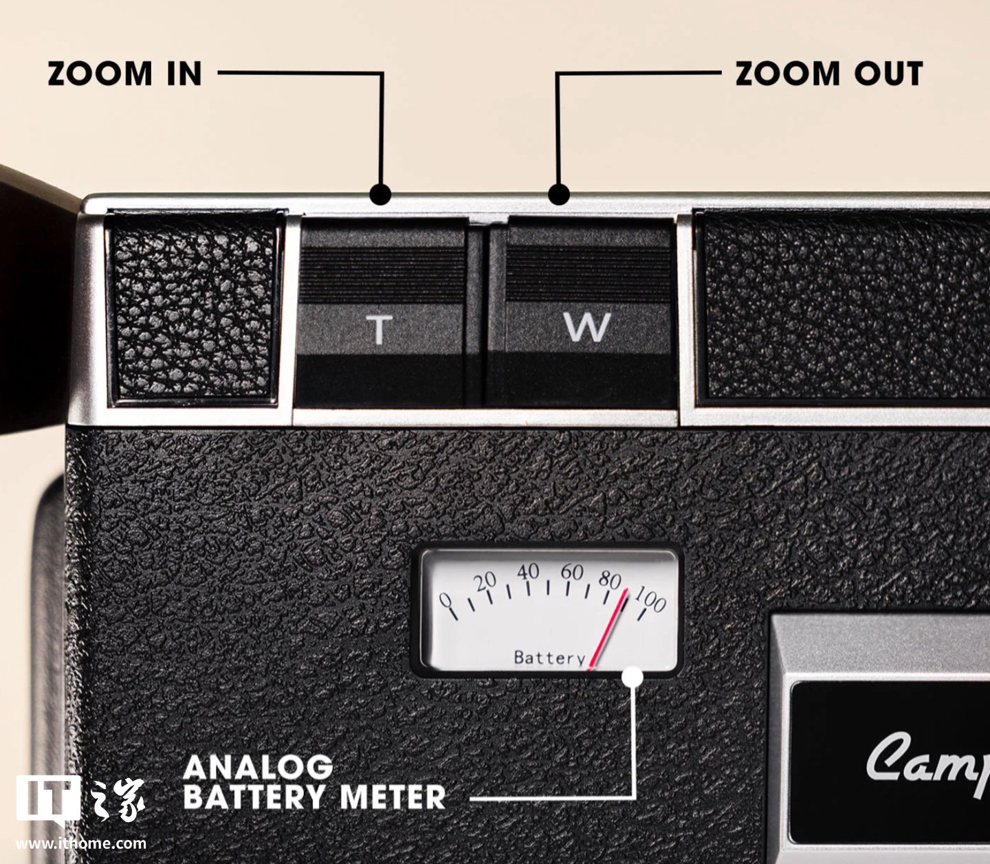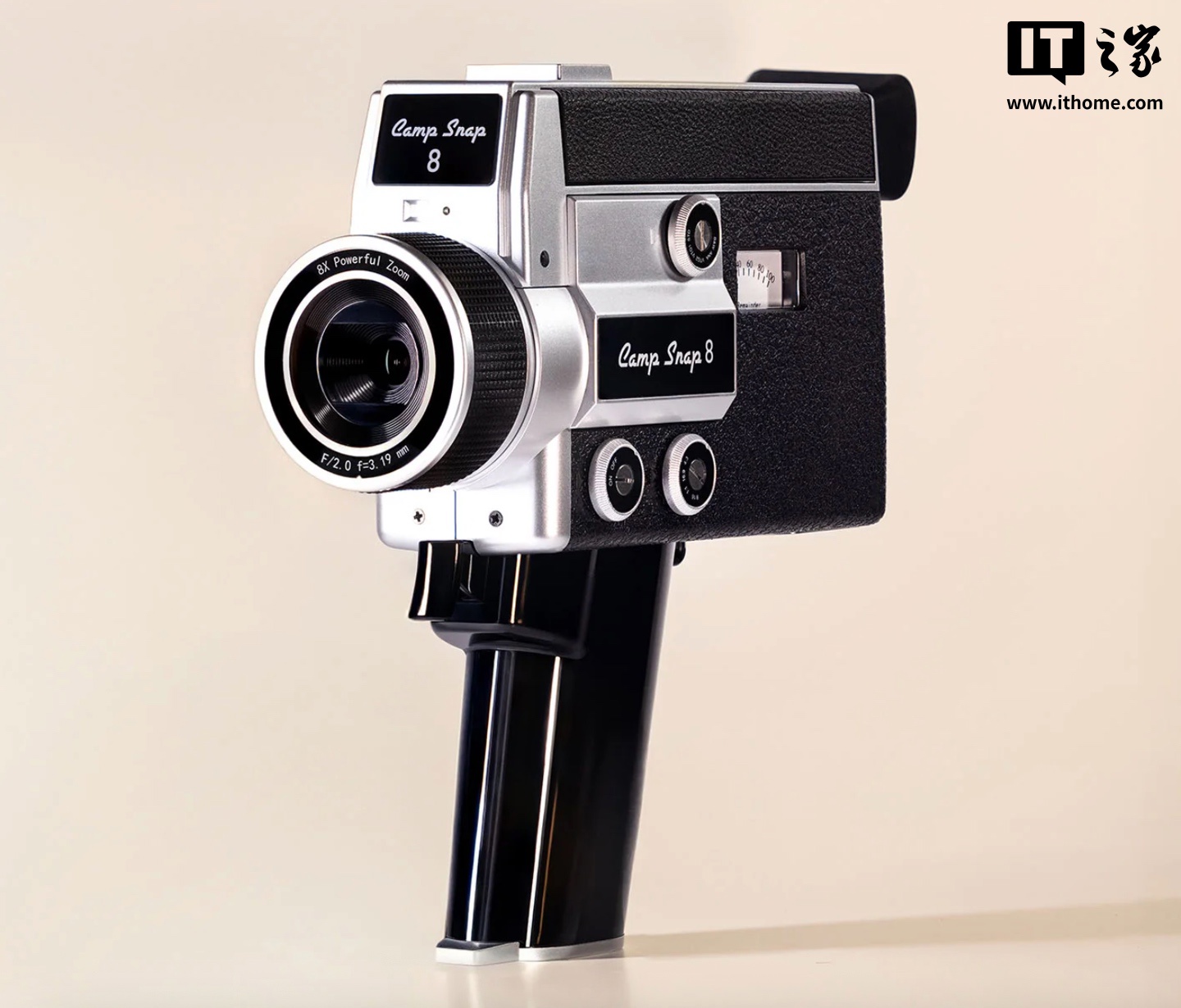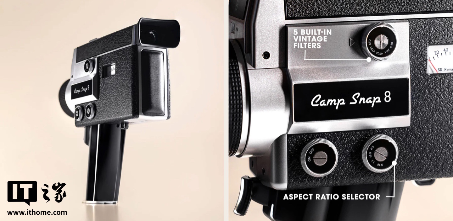 据介绍,Camp Snap CS-8 采用手枪式握把结构及扳机式快门按钮,用户只需用食指按下扳机即可开始或停止录像,号称“操作直观、尤其适合快速拍摄短视频”。机身侧面配备了实体仪表,用于显示剩余电量和 SD 卡存储空间;机器不设显示屏,仅提供电子取景器,以进一步还原胶片电影机的使用体验;机身侧边提供了一系列旋钮,可切换黑白 / 复古棕等滤镜,另一个旋钮则可调整画面比例,支持 16:9、4:3、9:16(竖屏)以及正方形格式。