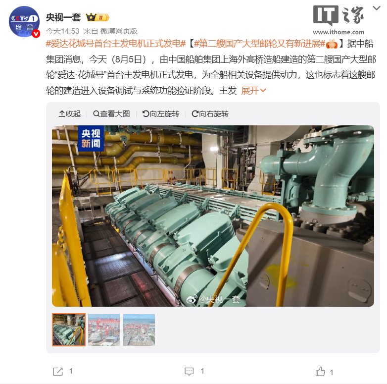 IT 之家 8 月 5 日消息,据央视新闻今天报道,由中国船舶集团上海外高桥造船建造的第二艘国产大型邮轮“爱达・花城号”首台主发电机正式发电,为全船相关设备提供动力,标志着这艘邮轮进入设备调试与系统功能验证阶段。
