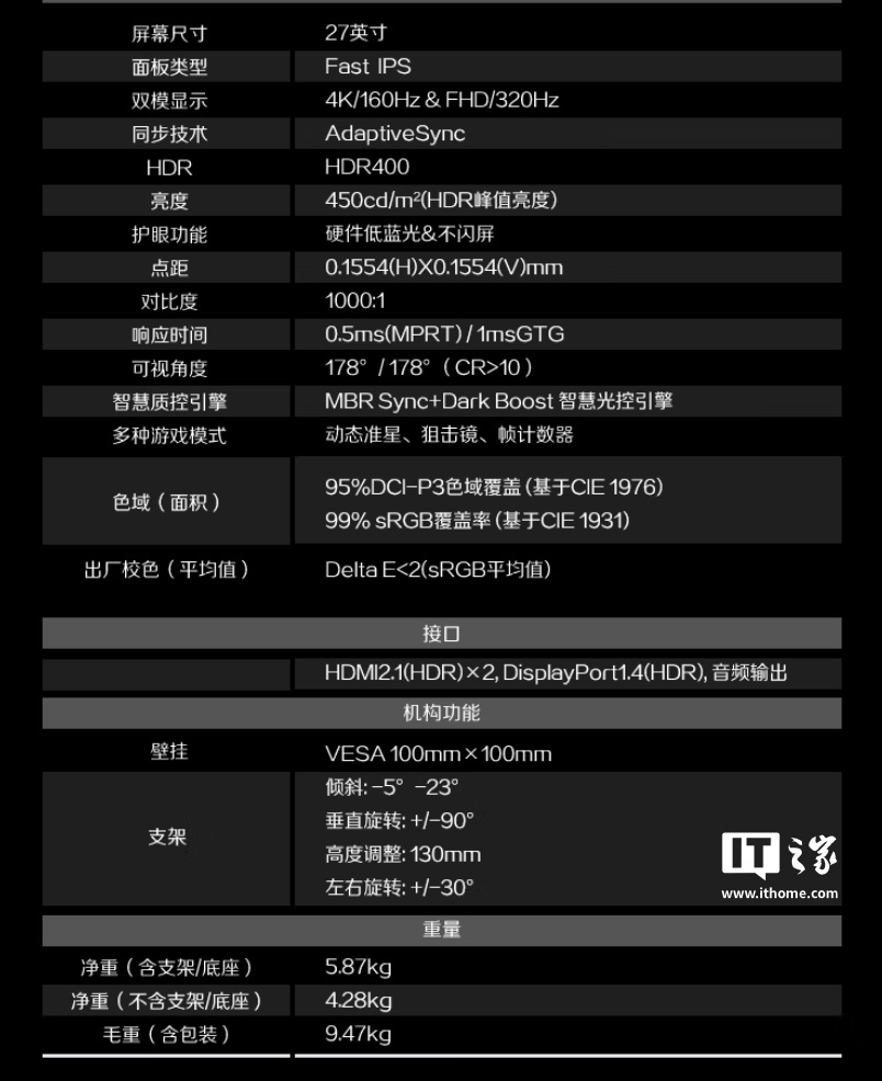 IT之家获悉,这款显示器配备的 Fast IPS 面板支持以 3840x2160 分辨率 160Hz 或 1920x1080 分辨率 320Hz 显示,亮度 450 尼特,静态对比度 1000:1,GtG 响应速度 1ms,支持 10-Bit 色彩(8-Bit + FRC),覆盖 100% sRGB 和 95% DCI-P3 色域。
