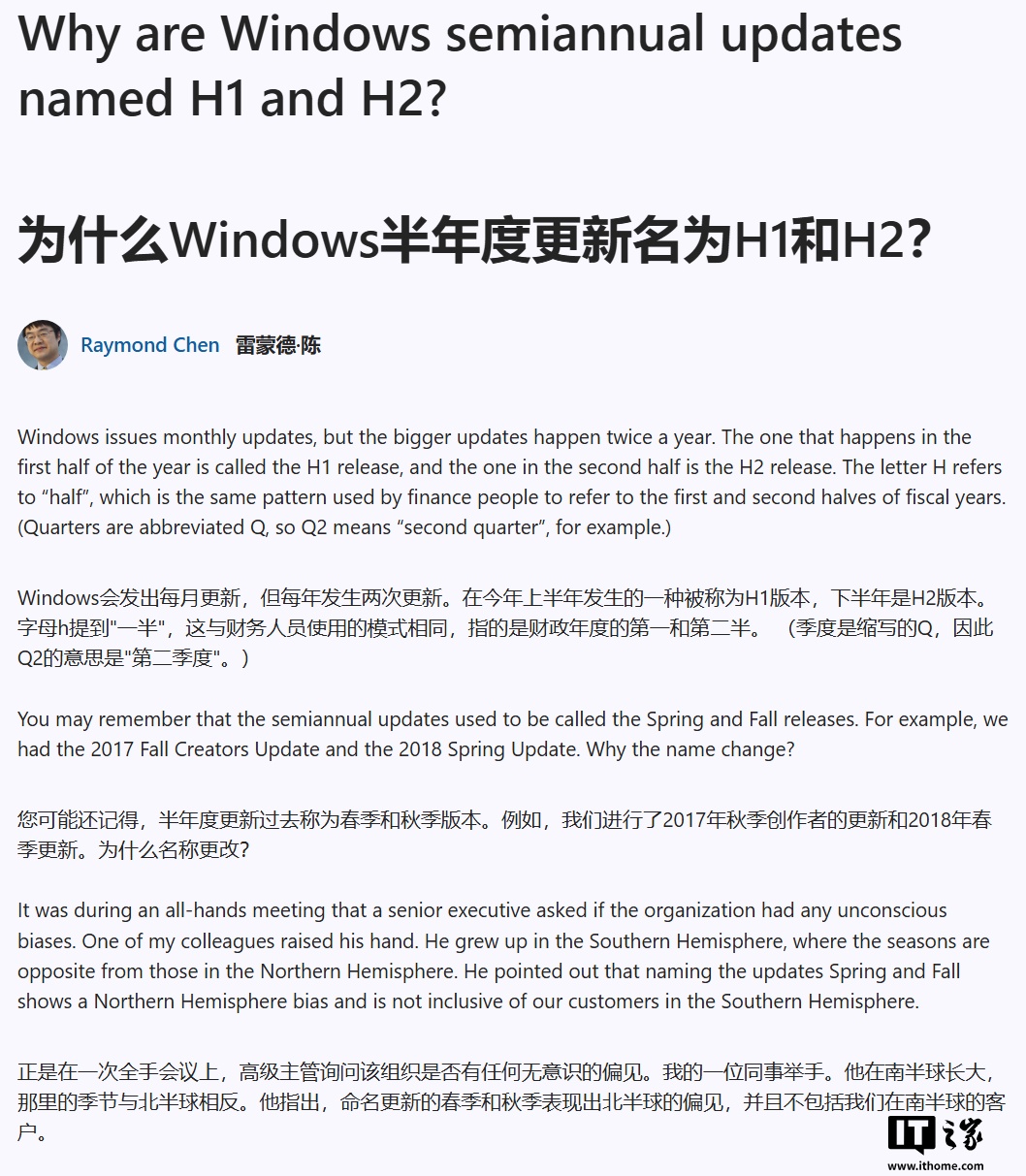 IT之家 8 月 6 日消息,微软资深开发者 Raymond Chen 昨日(8 月 5 日)通过其 The Old New Thing 博客,透露了微软为何在 Windows 系统放弃“春季更新”、“秋季更新”、“创作者更新”等名词的原因,改为更直观的“xxH2”命名规则。