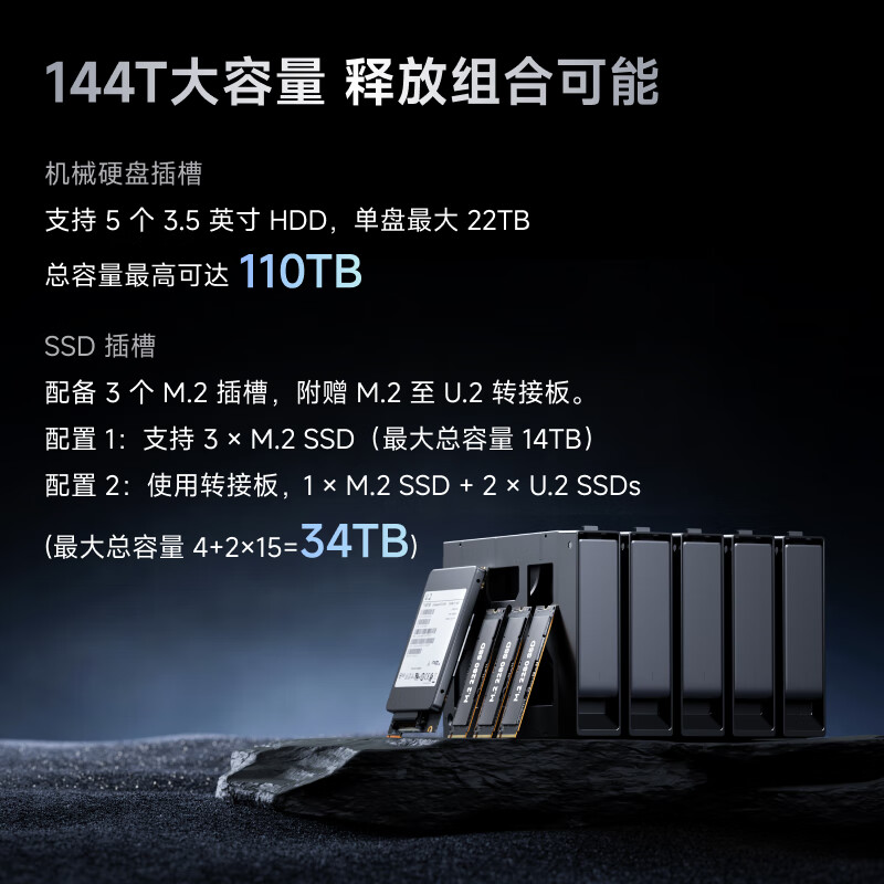 铭凡 N5 是一款 5× SATA III 3.5"/2.5" + 3× M.2 / U.2 的 5+3 盘位 NAS,提供 2 个 M.2 PCIe 4.0×1、1 个 M.2 PCIe 4.0×2,其中两个 M.2 盘位可转为 U.2。