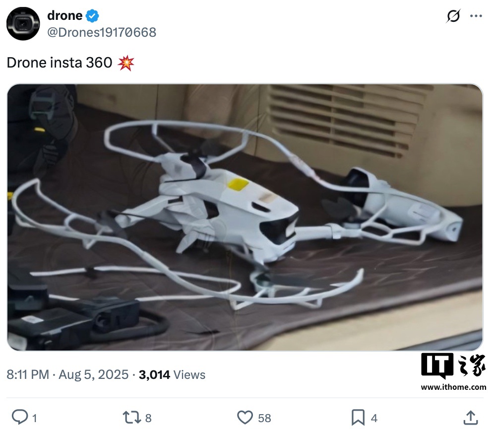 IT之家 8 月 6 日消息,消息源 @Drones19170668 曝光了影石 Insta360 旗下(影翎 Antigravity 品牌)首款无人机(无伪装衣)外观谍照,显示该机顶部具有凸起传感器,但具体功能暂不知悉。机身机臂支持折叠,同时匹配有桨叶保护罩。