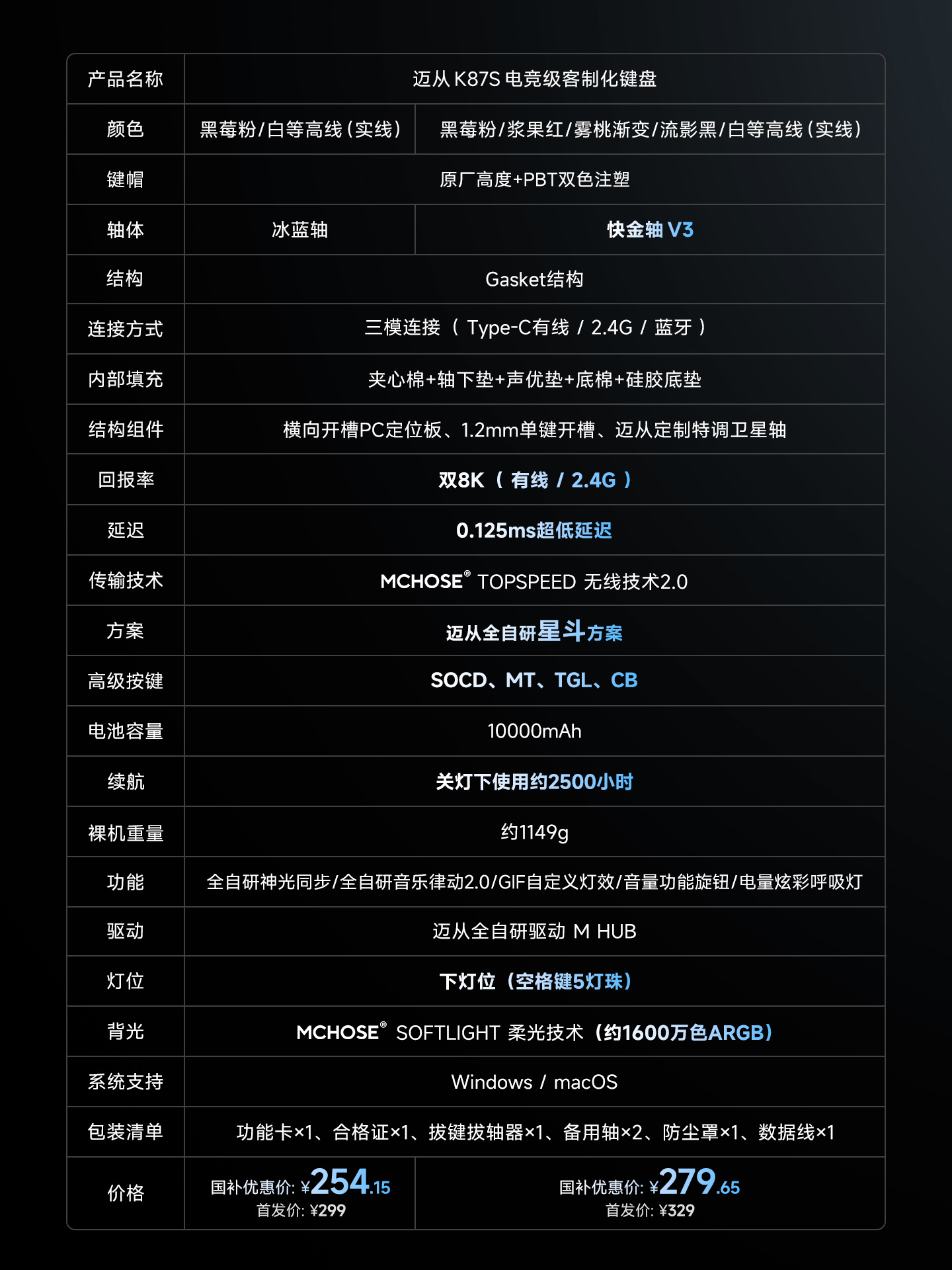 迈从 K87S 机械键盘环诺冰蓝轴低配版首发价 299 元、TTC 快金轴 V3 高配版 329 元,均可享受 15% 国家补贴。