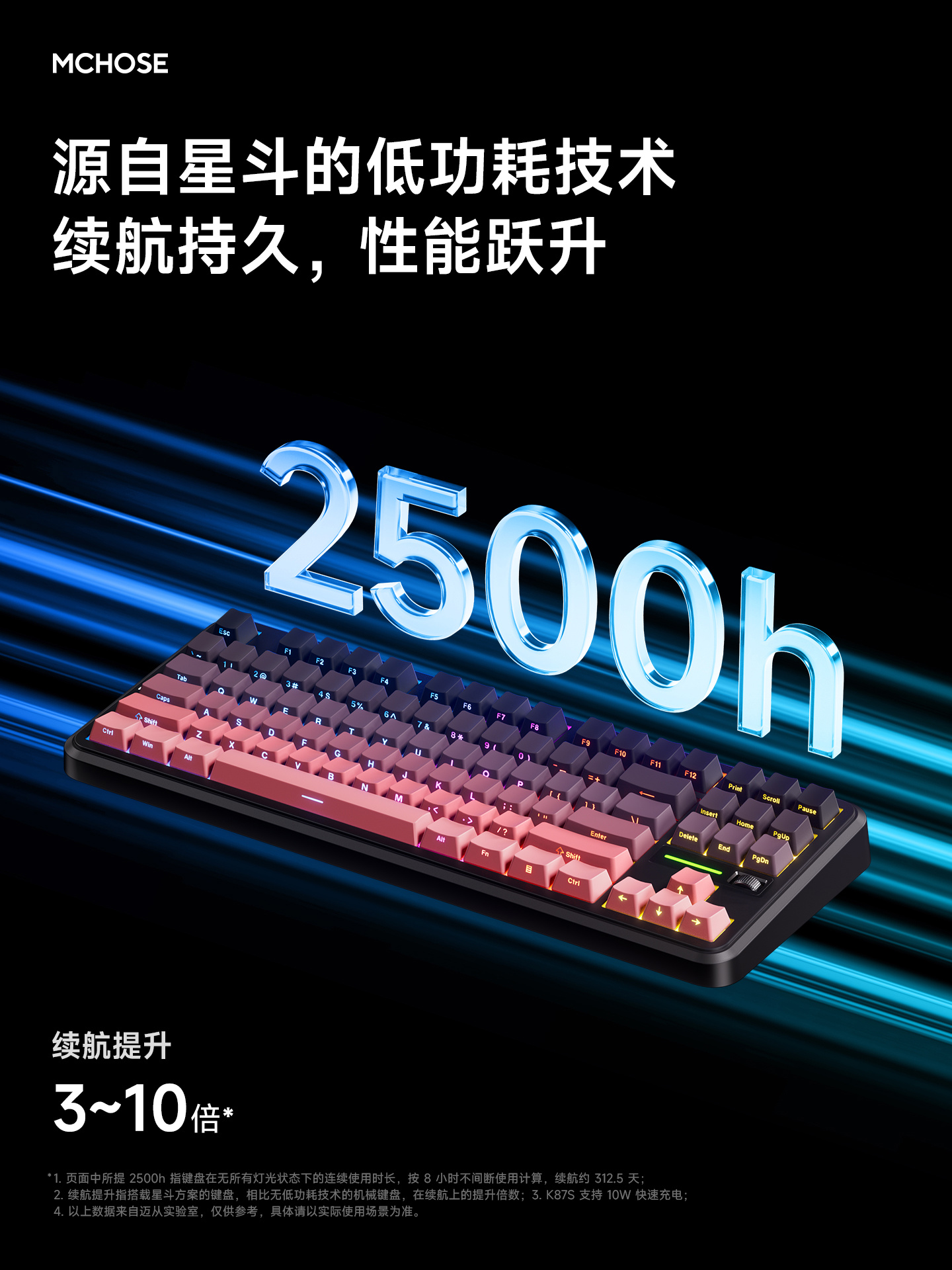 K87S 键盘内置 10000mAh 电池,支持 10W 充电,在关闭背光时最大续航可达约 2500 小时。