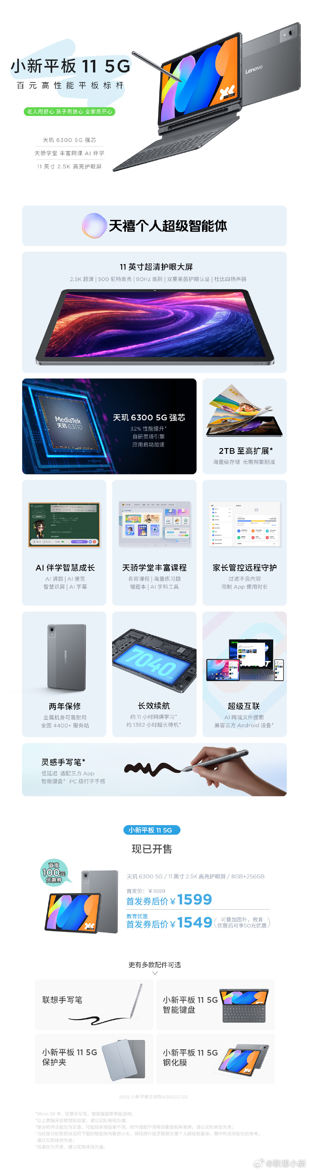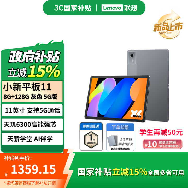 IT之家 8 月 6 日消息,联想宣布小新平板 11 5G 版开售,打搭载联发科天玑 6300,采用 11 英寸 2.5K 高亮护眼屏,配备 8+256GB 存储,首发价 1599 元,叠加国补后 1359.15 元,学生还能再减 50 元。