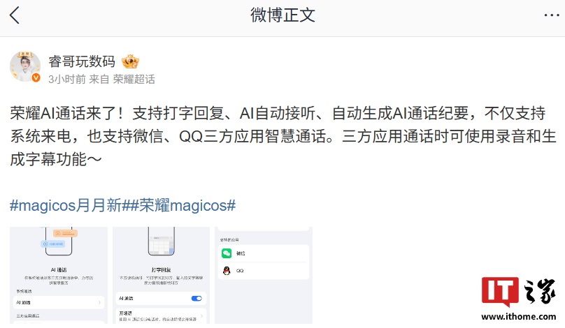 IT之家 8 月 7 日消息,荣耀官方产品维护 @产品经理回音壁 本月在荣耀俱乐部发布 MagicOS 8 月体验升级资讯,其中提到本月的新版本将增加 AI 通话助理功能。