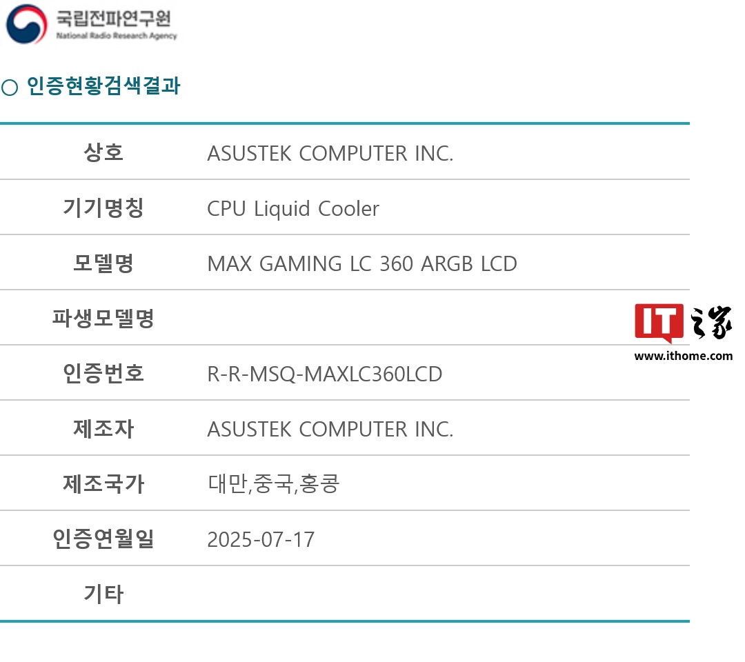 另据IT之家的了解,华硕还在韩国 RRA 注册备案了 MAX GAMING LC 360 ARGB LCD 一体式水冷散热器,而 MAX GAMING 也是 Prime 下的分支系列。