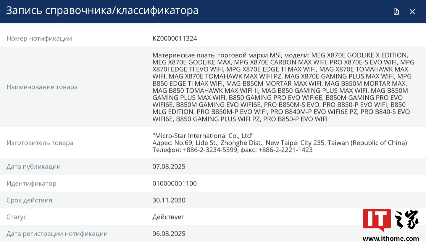 IT之家 8 月 8 日消息,参考 X 平台消息人士Алексей (@wxnod) 昨日爆料,微星本月向 EEC 欧亚经济委员会备案注册了新一批主板产品,其中包含目前 AMD MSDT 平台旗舰主板 MEG X870E GODLIKE“超神”的改款和采用二次元主题设计的“魔龙姬”主题型号。