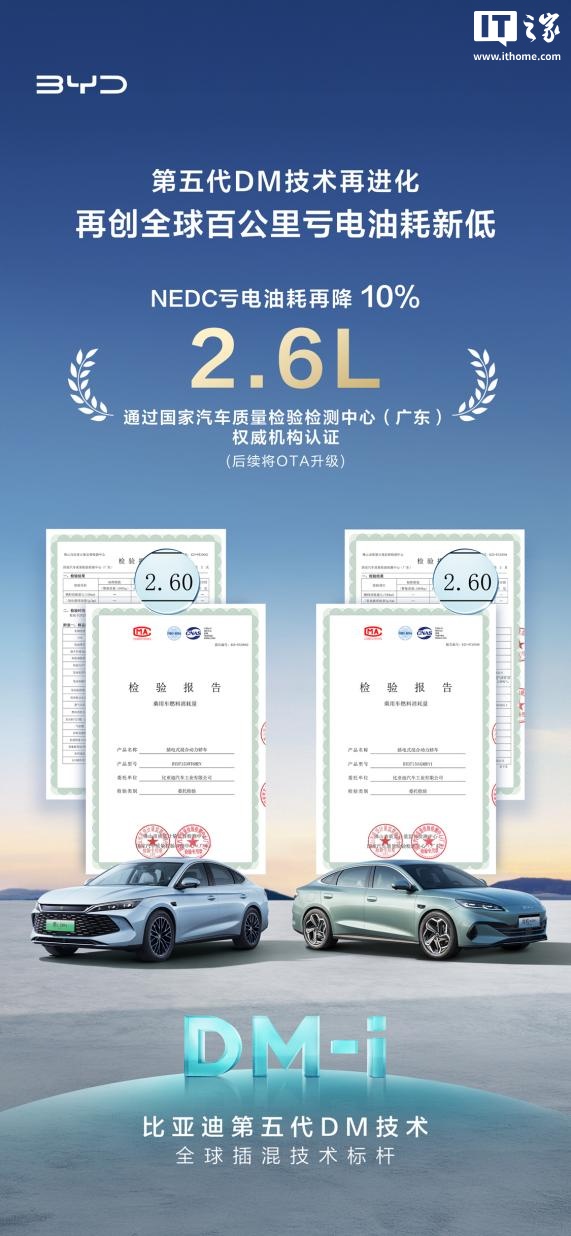 目前比亚迪第五代 DM 技术做到了 NEDC 百公里亏电油耗 2.6L,油耗再进化的策略可以通过 OTA 实现,我们正全力推进策略升级的备案规划,会优先推送用户基数最大的秦 L DM-i 和海豹 06 DM-i,后续其他五代 DM 车型也将陆续适配更新,具体推送时间请关注官方公告,将分批次有序推送,确保用户顺畅获取升级体验。
