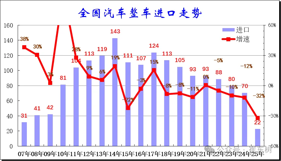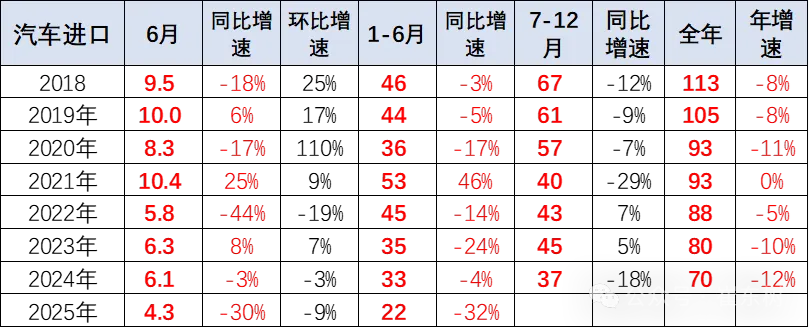 IT之家 8 月 8 日消息,乘联分会秘书长崔东树昨日(8 月 7 日)发布博文,报告称 2025 上半年中国进口汽车数量为 22 万辆,同比下降 32%,出现了近期少见的巨大跌幅,表明汽车进口市场的持续萎缩。