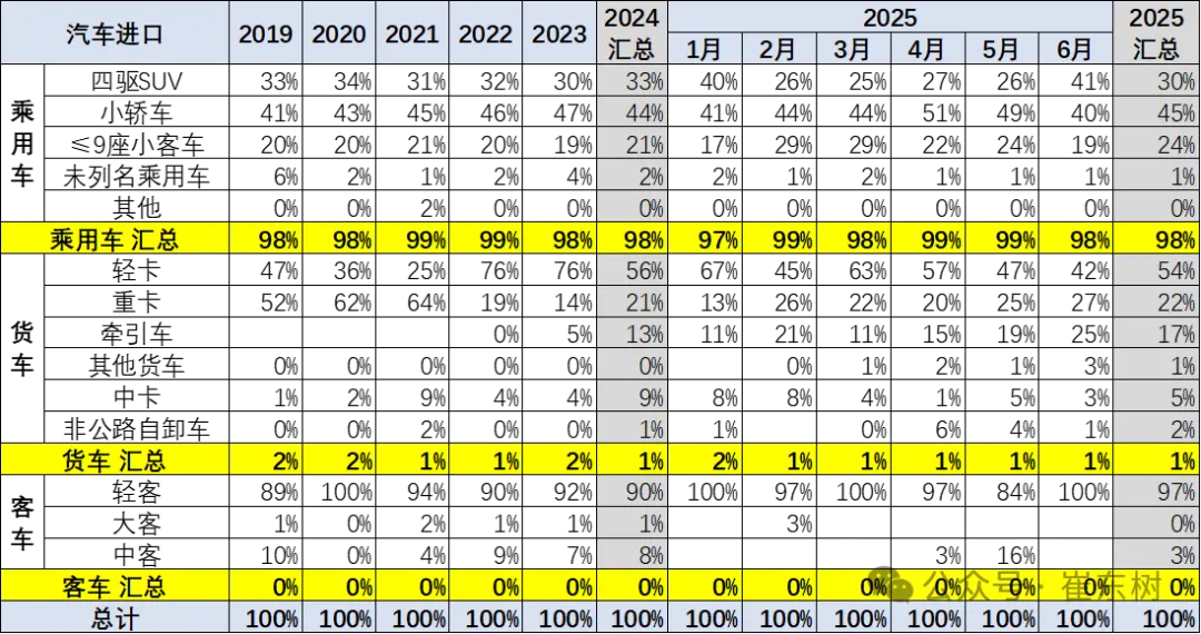 2025 年 6 月,进口汽车下滑压力较大,日本、美国、德国、斯洛伐克、英国是进口汽车数量最多的前五个国家。然而,由于中国自主车企的崛起和国际品牌本土化加速,进口汽车市场持续低迷,进口汽车持续 3 年负增长,如果熨平波动,则是连续 7 年的负增长。