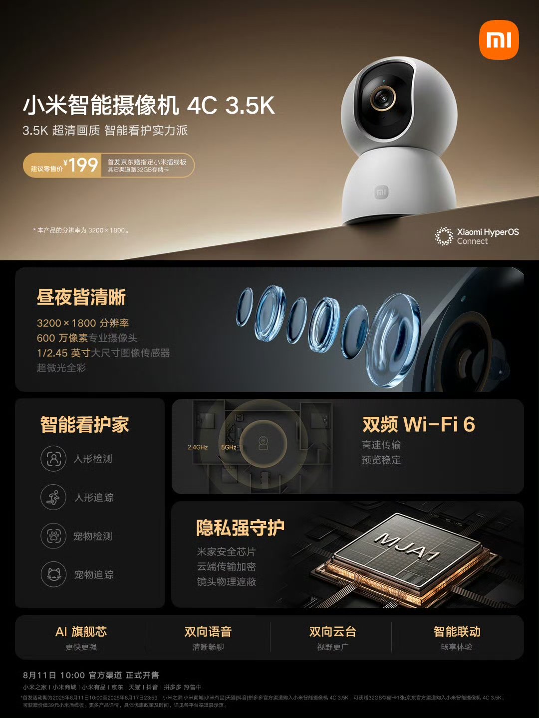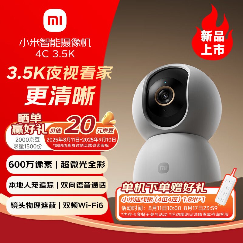 IT之家 8 月 8 日消息,小米智能摄像机 4C 3.5K 现已上架京东等平台并开启预约,8 月 11 日早 10 点正式开售,建议零售价 199 元。