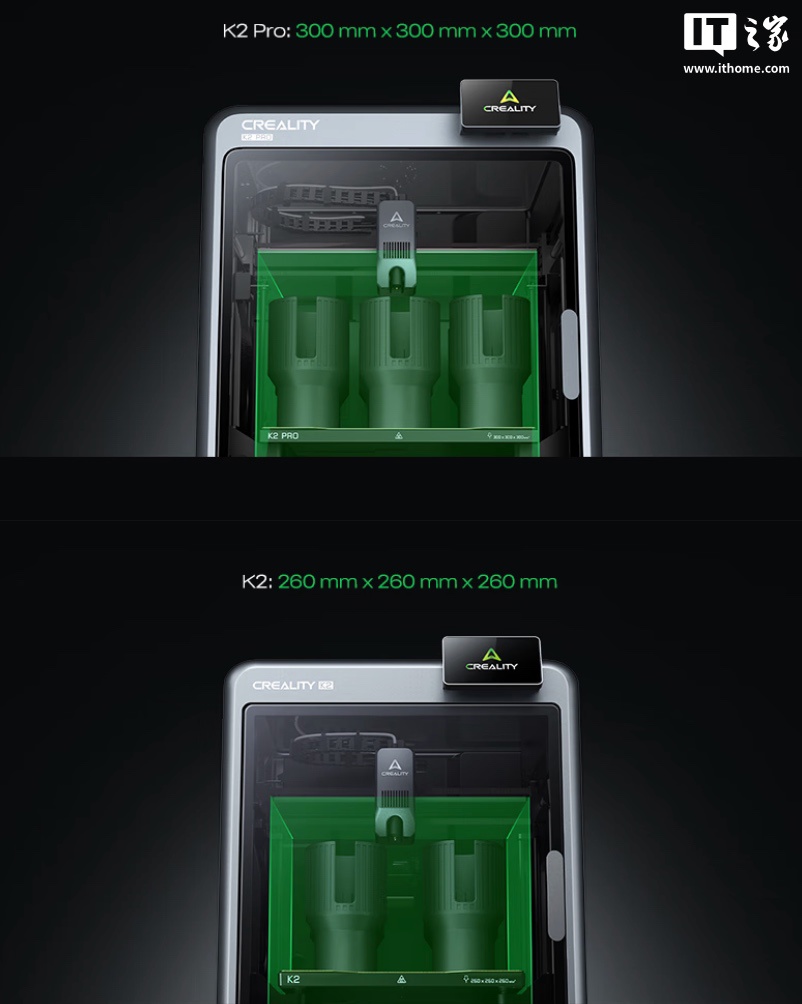 据介绍,K2 Pro 相对于 K2 的区别主要是打印尺寸更大,其中 K2 Pro 可以打印 300x300x300mm 物品,而 K2 可以打印 260x260x260mm 物品。