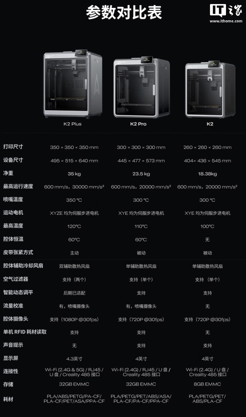 IT之家 8 月 9 日消息,创想三维旗下全新 3D 打印机 K2 / K2 Pro 现已在京东开启首销,其中 K2 定位入门级,单机 2999 元但电商平台未在销售,Combo 套装首发价 3199 元;K2 Pro 定位专业级,单机首发价 5899 元,Combo 套装定价 6899 元。