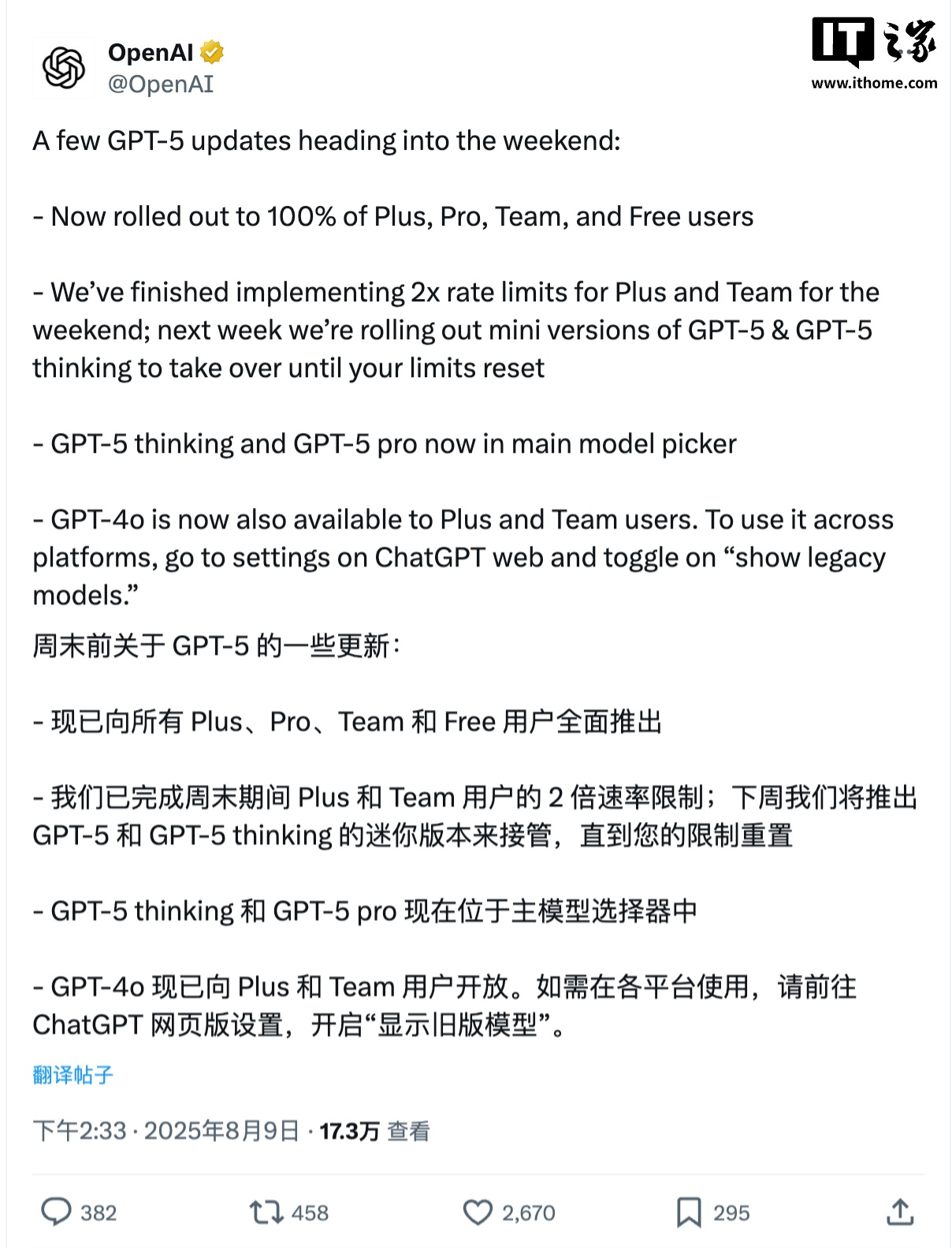IT之家 8 月 9 日消息,OpenAI 今天下午在 X 平台发布更新信息称,GPT-5 现已 Plus、Pro、Team 和免费用户全面推出,并对 Plus 和 Team 用户提升速率限制至 2 倍,下周还将推出迷你版 GPT-5 和 GPT-5 thinking,这两种模式已出现在主模式选择器中。