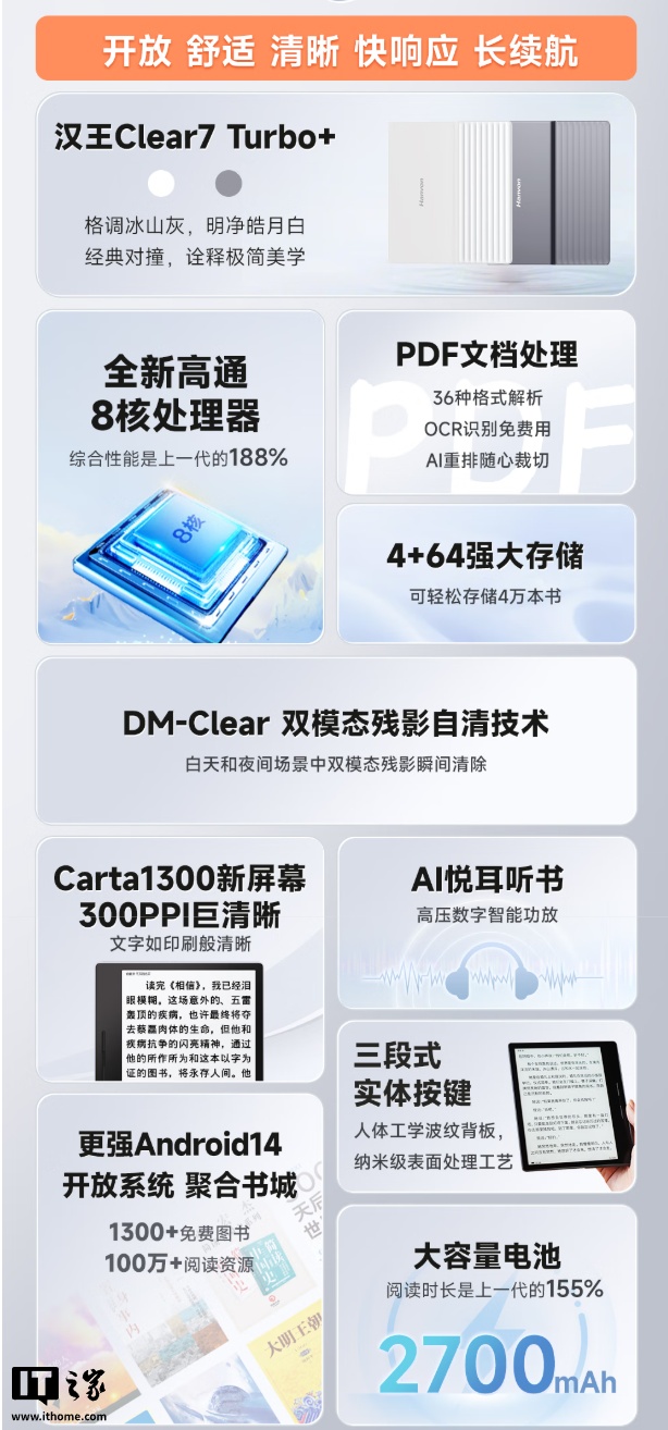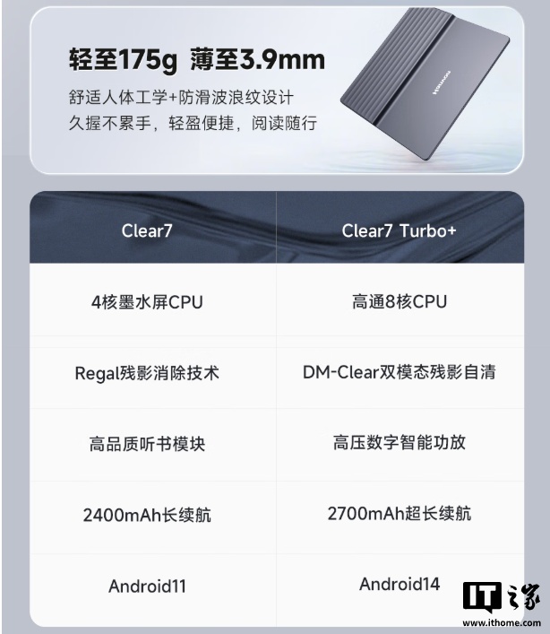 据汉王介绍,新增的“皓月白”版 Clear7 Turbo + 相比“冰山灰”版在硬件配置方面基本相同,主要是更新了配色;搭载一块 7 英寸 1680*1264 分辨率 300PPI Carta 1300 面板,引入 DM-Clear 双模态残影自清技术,号称“无需手刷即可自动瞬清残影”。