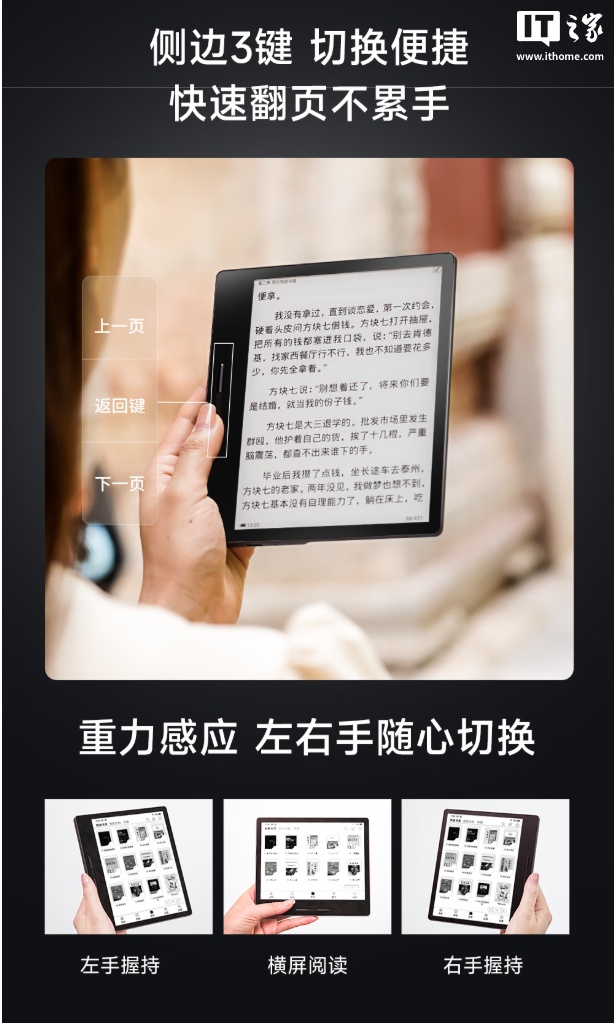 易用性方面,这款电纸书支持 PDF 重排、免费 OCR 识别,机身左侧带有机械翻页按键,支持重力感应,可更加方便地阅读各种文档。