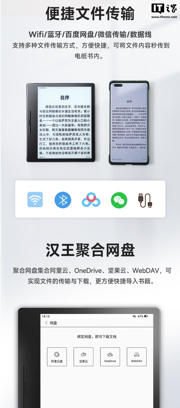 此外,这款电纸书还支持 WiFi / 蓝牙 / 百度网盘 / 微信传输 / 数据线等多种文件传输,用户可使用手机或电脑对书库进行管理。当然也可以使用聚合网盘功能,实现阿里云、OneDrive、WebDAV 等网盘的聚合传输与下载,快捷导入书籍。
