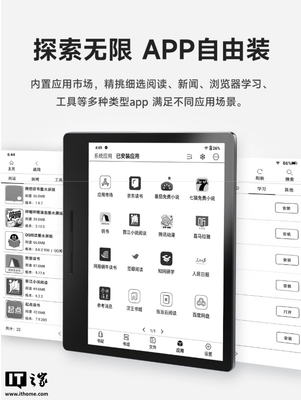 硬件配置方面,这款电纸书搭载高通 8 核处理器,内存 / 存储空间组合为 4GB / 64GB,号称可“轻松存储 4 万本书”;配有聚合书城,自带 17K 小说、当当、微信、京东读书等在线书城,支持安装第三方 App,用户可根据个人喜好自行添加书库 App。