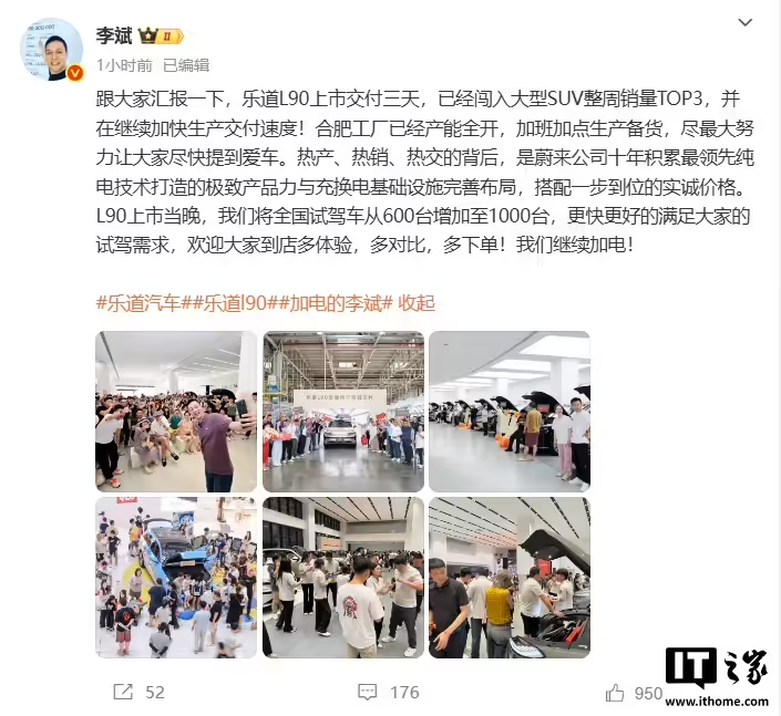据IT之家报道,上周乐道 L90 上市三天交付了 1900 多台,已经闯入大型 SUV 整周销量 TOP3,并在继续加快生产交付速度。李斌在微博中称,合肥工厂已经产能全开,加班加点生产备货。热产、热销、热交的背后,是蔚来公司十年积累最领先纯电技术打造的极致产品力与充换电基础设施完善布局,搭配一步到位的实诚价格。