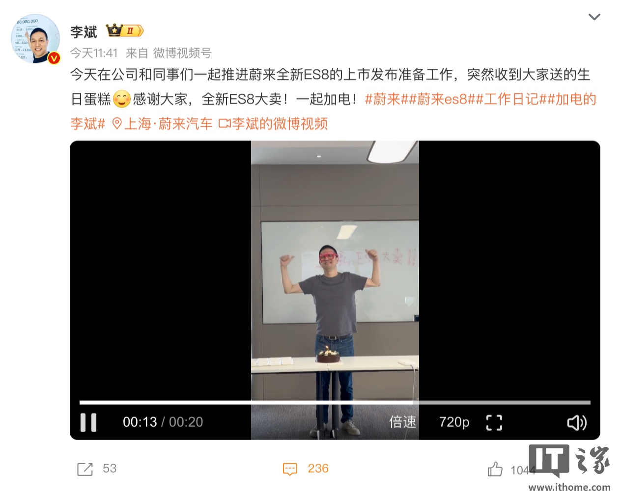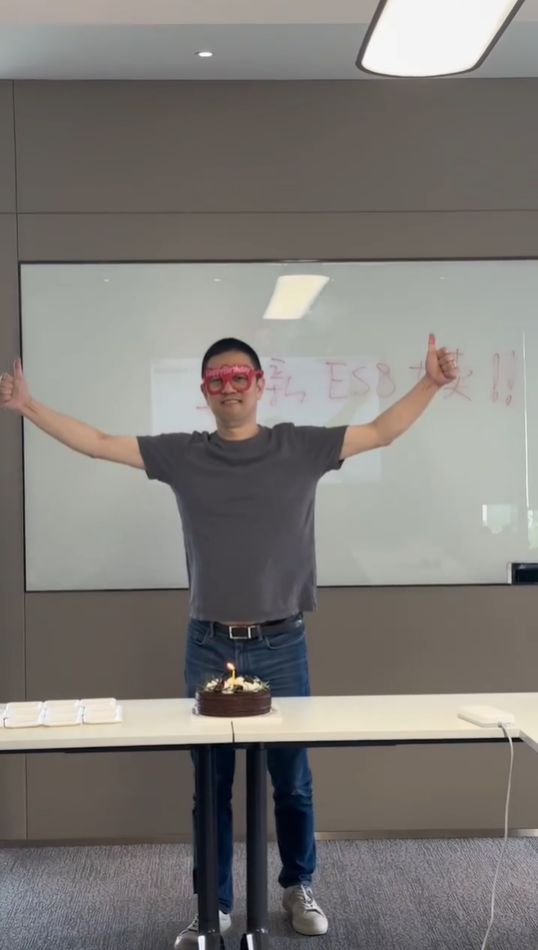 IT之家 8 月 9 日消息,今日,蔚来创始人、董事长兼 CEO 李斌在加班中迎来了自己的生日。从其微博分享的视频可见,他在公司简单吹了一个小蛋糕并许下心愿 —— 祝愿全新 ES8 大卖。