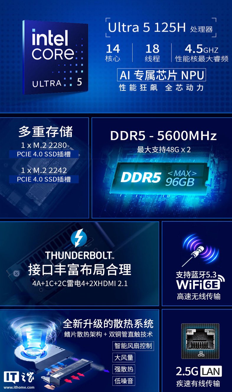 该机搭载 14 核心 18 线程英特尔酷睿 Ultra 5-125H 处理器,配备 16GB DDR5 5600MHz RAM,其包含 2 个 PCIe x4 的 M.2 插槽,其中一个为 2280 规格,另一个为 2242 规格(目前上架版本已附 512GB SSD),使用单风扇 + 双铜管散热。