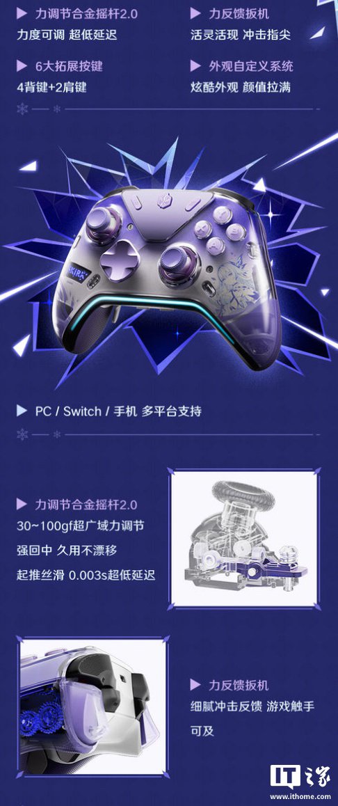 IT之家 8 月 10 日消息,米哈游《原神》与飞智合作,基于飞智八爪鱼 5 推出一款“丝柯克・虚渊暗星游戏手柄”,该手柄将于今年 12 月发货,定价 749 元,礼盒套装为 899 元。