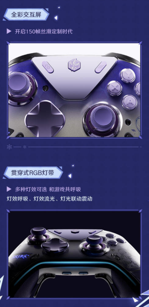 外观方面,IT之家注意到这款手柄使用“丝柯克”印象色,左侧握把镶嵌可替换灯牌,右侧握把将角色立绘融入设计,其全彩交互屏还支持自定义设置 GIF 动图,同时配有可选灯效的贯穿式 RGB 灯带。