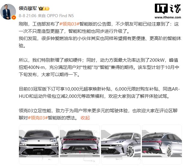 穆军透露,领克 03 智能版这一次不只是造型更酷了,智能和性能也同步进行升级了,特别新增了感知硬件。同时,动力方面最大功率达到了 200kW,峰值扭矩 400N・m,充分满足用户对“性能”与“智能”兼得的期待,该车型计划于 10 月中下旬发布。