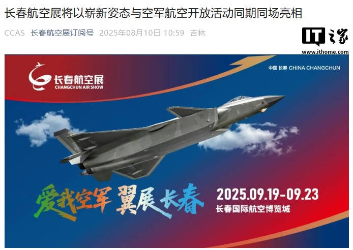 IT之家 8 月 10 日消息,9 月 19 日至 23 日,2025 长春航空展与空军航空开放活动同期在长春国际航空博览城举办。期间将举办飞行表演、eVTOL 动态展演、无人机集群表演、武器装备展、军工央企展、低空经济展等展览展示,以及航天科普、文博展览、群文展演等航空主题活动。