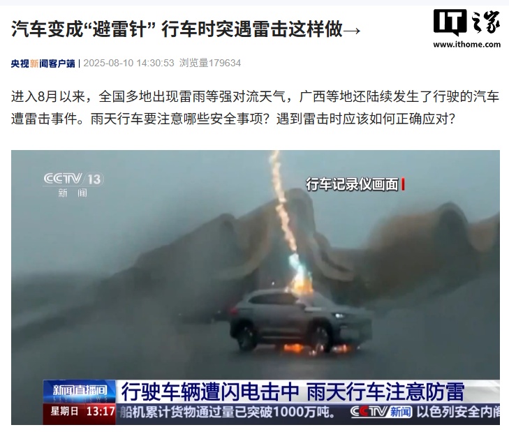 IT之家 8 月 10 日消息,据央视新闻报道,进入 8 月以来,全国多地出现雷雨等强对流天气,广西等地还陆续发生了行驶的汽车遭雷击事件。雨天行车要注意哪些安全事项?遇到雷击时应该如何正确应对?