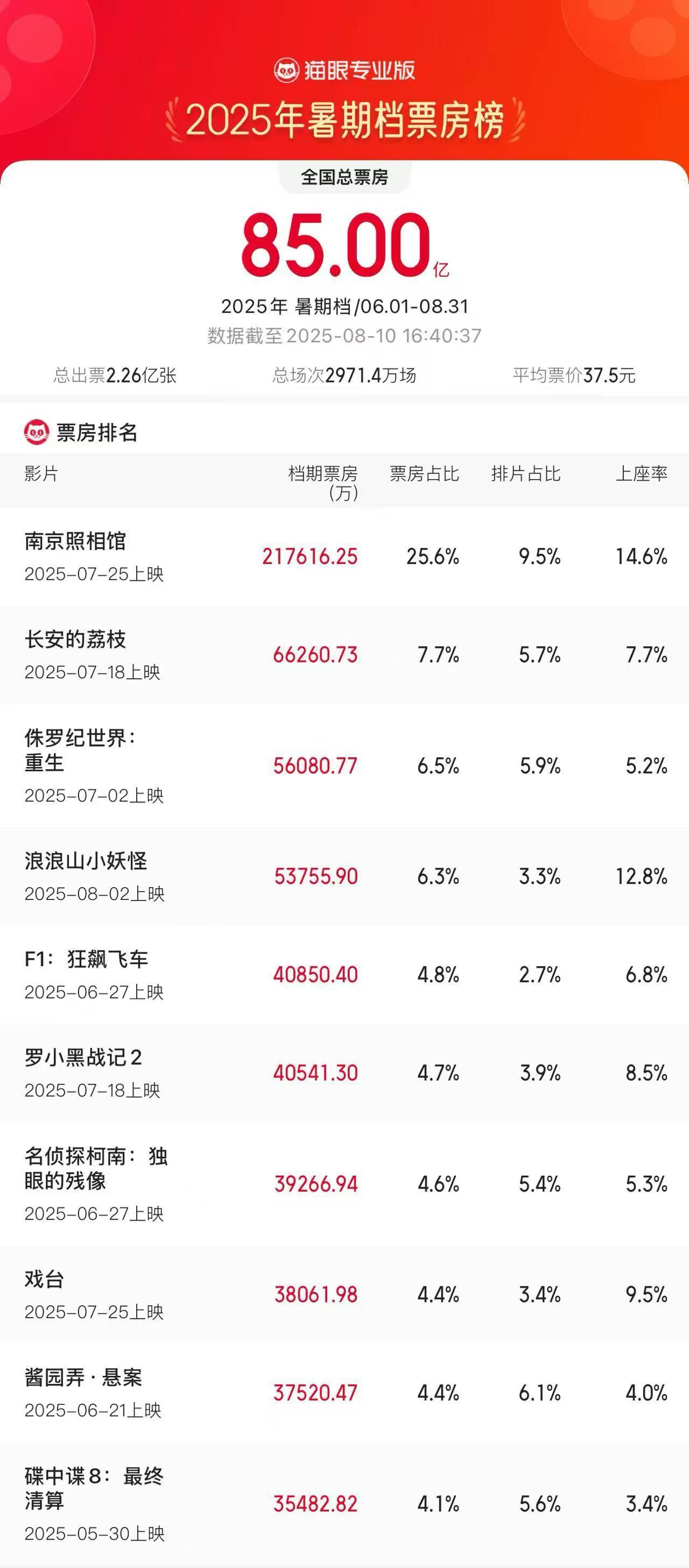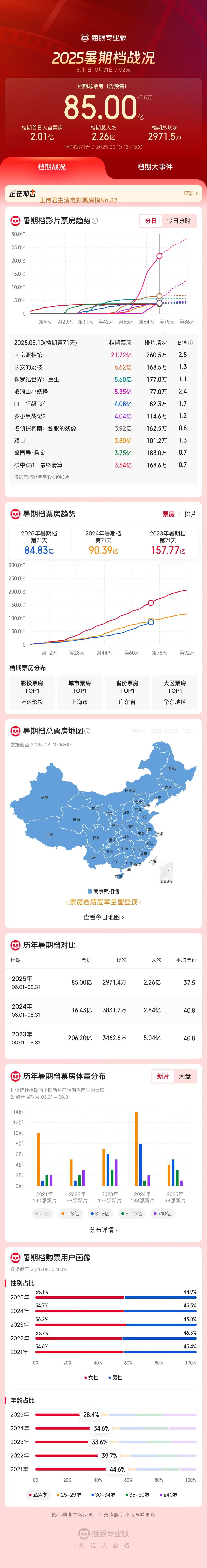 IT之家 8 月 10 日消息,据猫眼专业版数据,截至 8 月 10 日 16 时 41 分,2025 年暑期档总票房(含预售)破 85 亿,《南京照相馆》《长安的荔枝》《侏罗纪世界:重生》分列暑期档票房榜前三位。