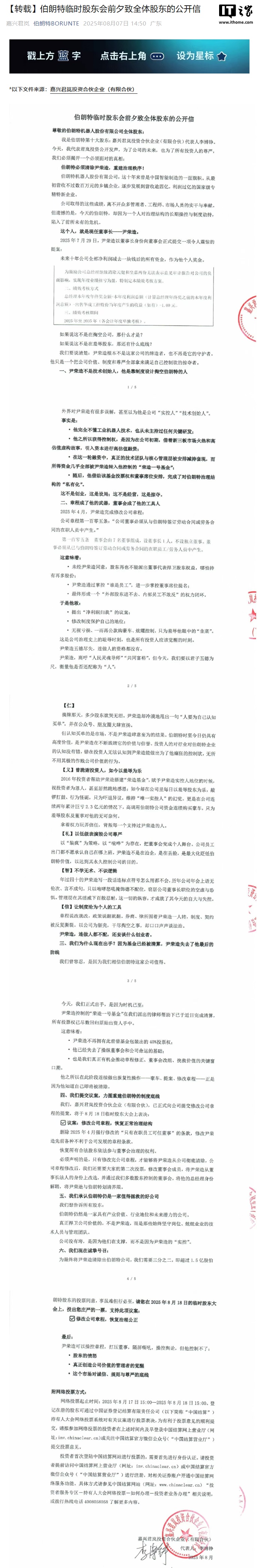 IT之家注意到,8 月 7 日,伯朗特官方公众号以转载的形式发布了投资方之一 —— 君岚投资的一则致全体股东公开信。信中指出伯朗特机器人现任董事长兼总经理尹荣造靠制度设计掏空伯朗特、羞辱股东,并号召股东投票同意修改公司章程、恢复正常治理结构,将尹荣造清除出伯朗特公司。