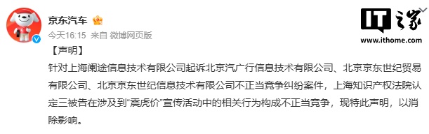 京东汽车 8 月 4 日发布声明:“针对上海阑途信息技术有限公司起诉北京汽广行信息技术有限公司、北京京东世纪贸易有限公司、北京京东世纪信息技术有限公司不正当竞争纠纷案件,上海知识产权法院认定三被告在涉及到‘震虎价’宣传活动中的相关行为构成不正当竞争,现特此声明,以消除影响。”