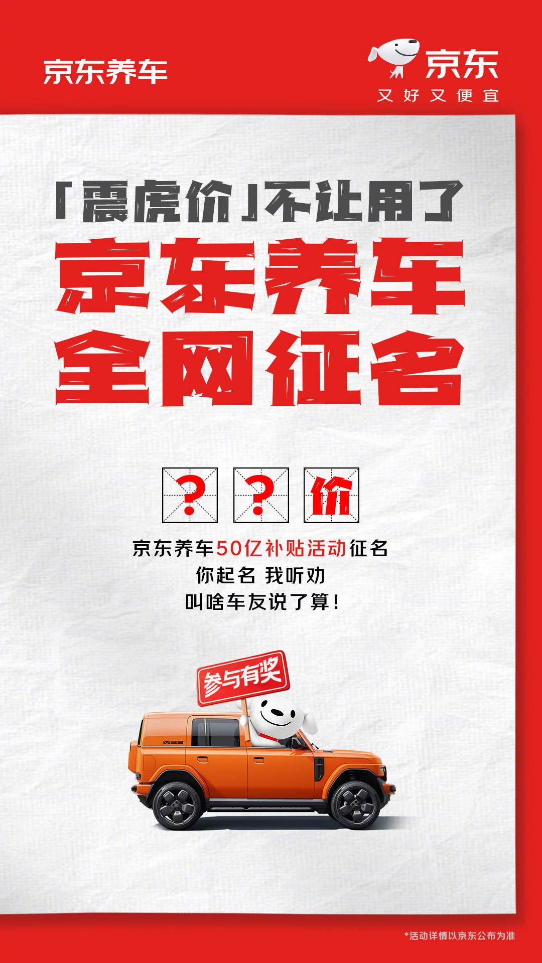 对此,京东养车相关负责人回应贝壳财经称,“很遗憾友商认为‘震虎价’对他们产生了影响,但‘震虎价’只是一个名字,京东养车将推出 50 亿养车补贴活动,同时面向全网征集新名称,参与用户有机会获得汽车使用权大奖”。