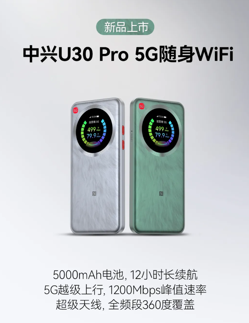 IT之家 8 月 11 日消息,中兴今天发布了 U30 Pro 5G 随身 WiFi,内置 5000mAh 电池,采用贴片 SIM 卡设计,可随时切换运营商。
